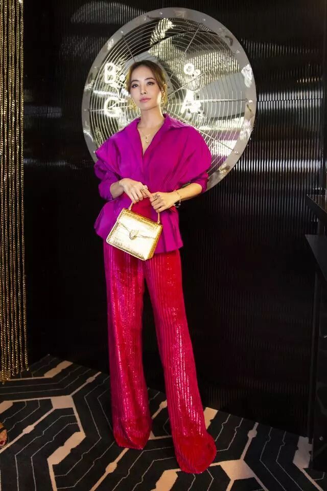 這一身大紅褲配枚紅色的上衣,也是搶鏡了焦點,上衣雖然是寬鬆的設計,但是收腰的款式很好的拉長了下半身的視覺!