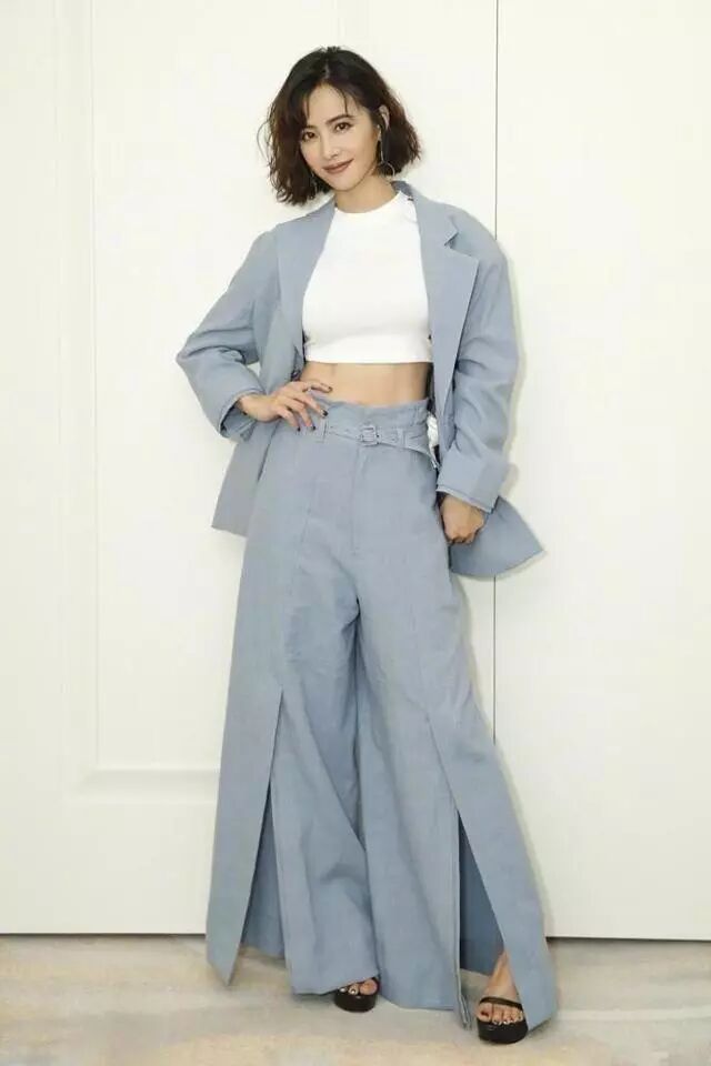 所以想這樣的大闊腿褲她都可以輕鬆駕馭,上衣露出小蠻腰,不用秀腿,都可以顯得人很高挑養眼!