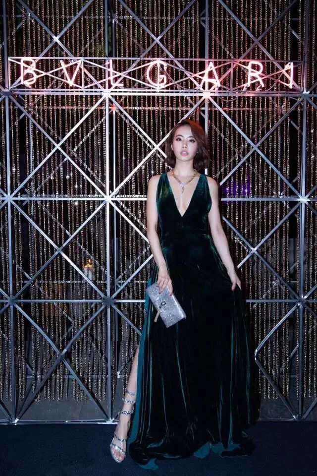 綠色的V領長裙,盡顯蔡依林高貴典雅的氣質!加上一頭短髮,非常的幹練有精神,手拿銀色的包包,腳踩同色系的鞋子,都給整個造型增添了不少的亮點!