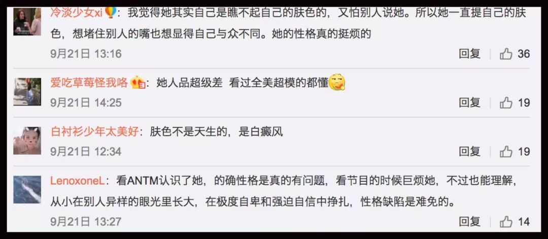 @冷淡少女xi:我覺得她其實自己是瞧不起自己的膚色的,又怕別人說她。所以她一直提自己的膚色,想堵住別人的嘴也想顯得自己與眾不同。