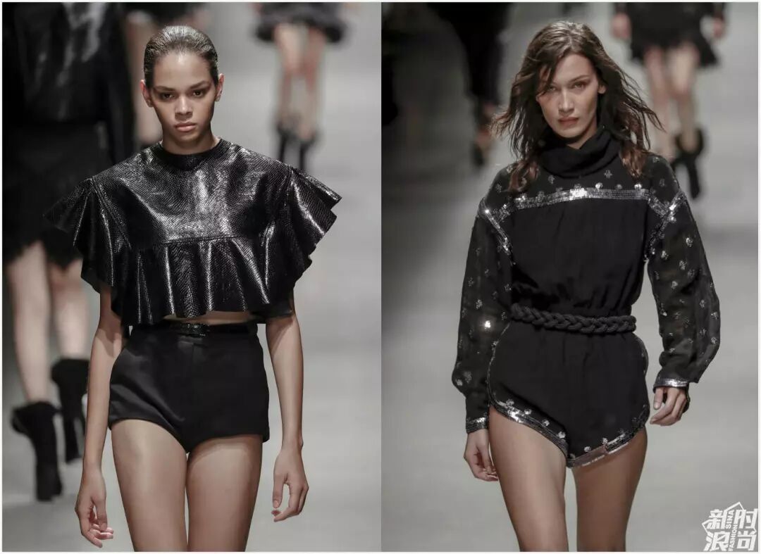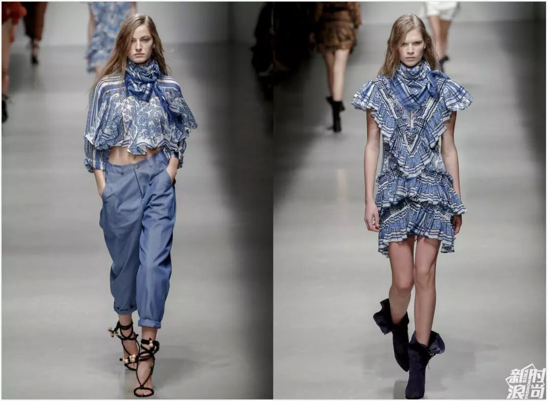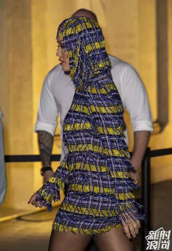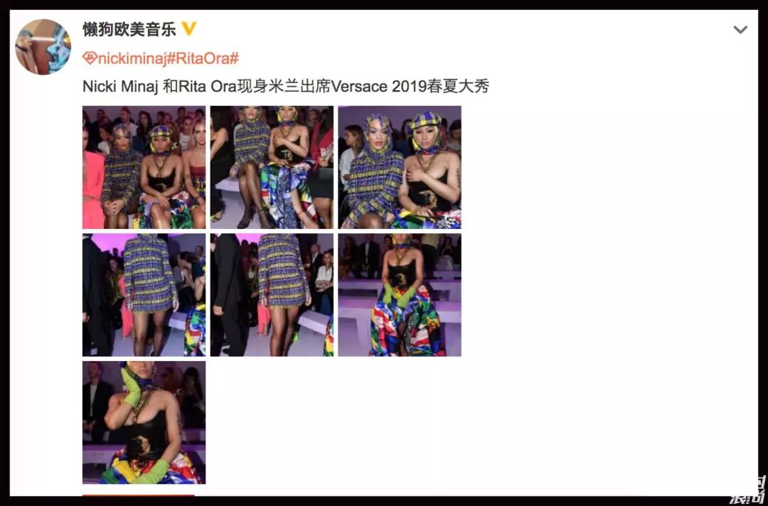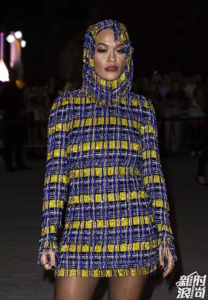 秀場內,麻辣雞和一起來看秀的Rita Ora ,把Versace穿出了中東石油風,穿越到了《唐伯虎點秋香》。或者在國產大戲在《秋菊打官司》里應該也很入畫。