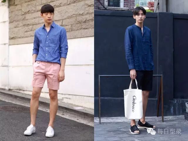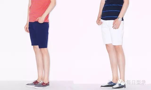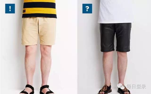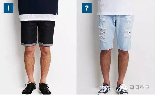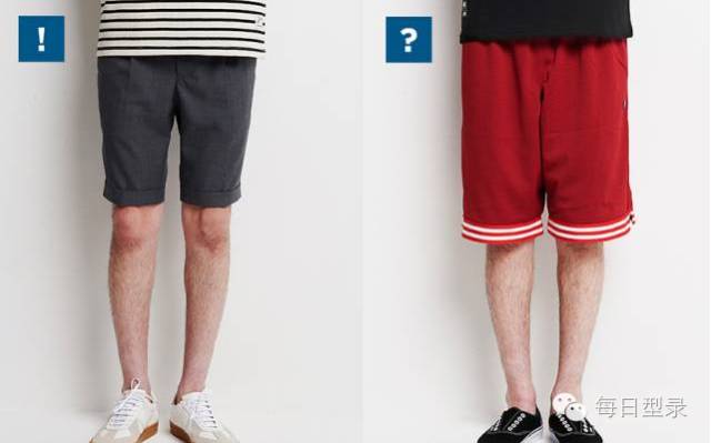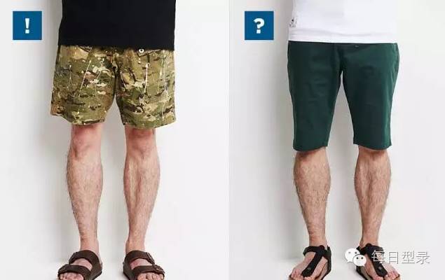 相對於純色短褲,應選擇搶眼的印花款式,從視覺對比上削弱腿肚粗的感覺。短褲的長度剛好到膝蓋上方為佳。印花款式短褲應當搭配簡單純色的T恤來平衡整體穿搭。右圖的斜紋布短褲有凸顯腿型的視覺效果,適合個子高小腿細的人。
