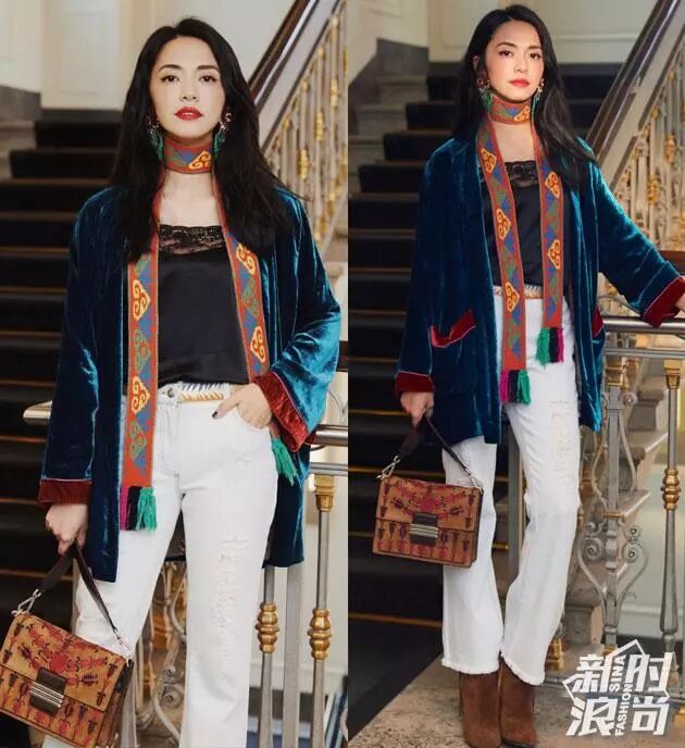 小花旦喬欣受邀出席米蘭時裝周,logo亮片T恤搭配流蘇牛仔褲獨特率性,黑色踝靴增添了一絲嫵媚,打造復古摩登感,另一個造型波西米亞風白色襯衫唯美浪漫,黑色馬甲和皮褲的配搭增加層次感的同時也融入了更多帥氣。