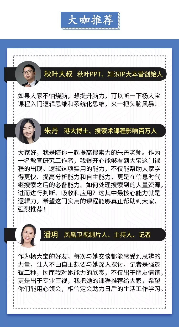 這次,職場充電寶Pro獨家和楊大寶老師合作,深入打造了顛覆你思維、純乾貨的「超級邏輯」課程《人生第一堂邏輯實戰課,12招讓你看得透!幹得好!學得快!》,大寶的大咖朋友們也紛紛來支持: