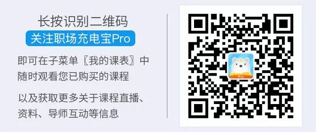 A:關注微信公眾號「職場充電寶Pro」(二維碼在上面),在子菜單「我的課表」中能查看到你購買過的所有課程,打開課程隨時學習