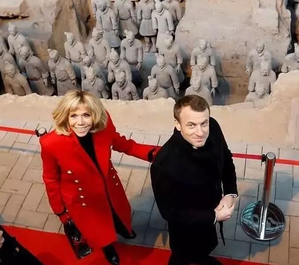 馬克龍夫婦參觀西安兵馬俑,現場布麗吉特給他介紹起了中國的兵馬俑文化,她當過老師,以前也只是從書中了解中國的古文明,第一次跟馬克龍一起親眼所見非常激動。兩人先後到過日本和印度,就像一對情侶環遊世界一樣。