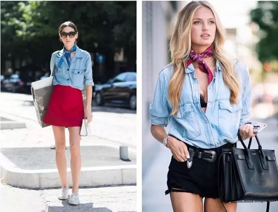 自古紅藍出cp,藍色搭配紅色很亮眼。加個紅絲巾或者紅包包,恰到好處的起到點睛作用。