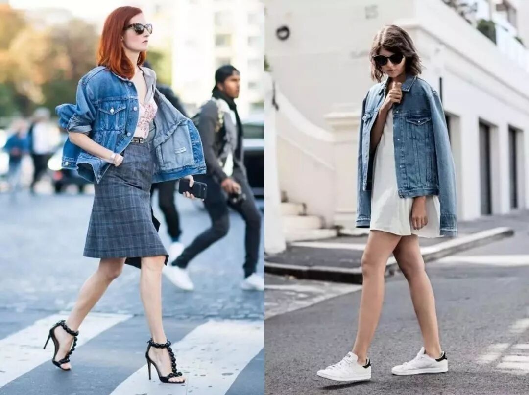 尤其是牛仔夾克+半裙,不只適合學生黨,換上職場一些的闊擺裙女人味就出來了,鞋子是關鍵,高跟鞋更正式。