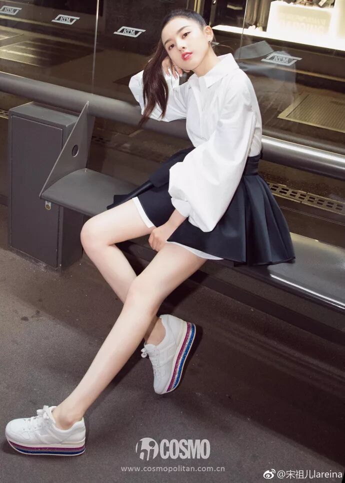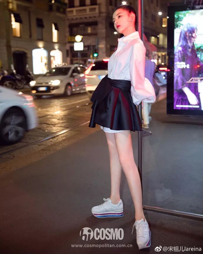 發布會之餘,宋祖兒還在米蘭街頭為HOGAN拍攝了一組時尚大片。照片中祖兒身穿白襯衫,外搭一件黑色小短裙露出襯衫的邊邊,層次感十足。腳下則是踩了一雙彩色閃粉厚底鞋,整個人俏皮可愛,大長腿也分外惹眼。