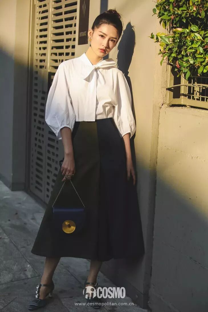 看秀時,李沁則是選擇了白襯衫和綠色半裙的造型,整體造型復古典雅,領口的蝴蝶結綁帶又帶了些許甜美靈動之感,美得不可方物。李沁這套服裝來自Marni 2018秋季,手袋是Marni 2018 秋冬系列的Monile。