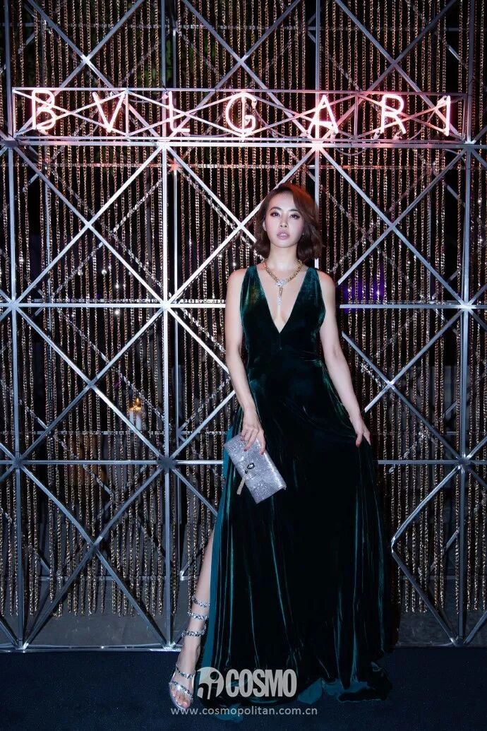 夜晚來襲,蔡依林一襲墨綠色深V晚禮服搭配蛇形項鏈,手拿銀色亮粉手包,性感亮相寶格麗晚宴派對,無處不散發著高貴優雅的「大女人」魅力。