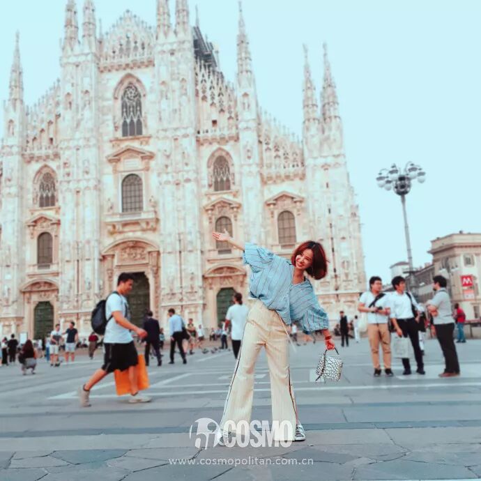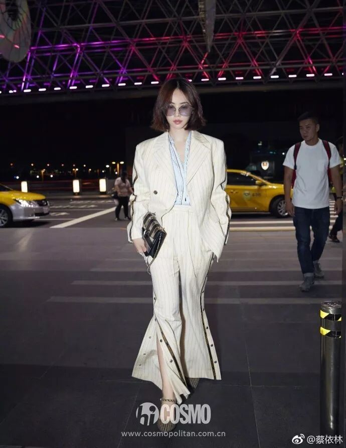 啟程米蘭,Jolin身穿條紋西服套裝,手拿BVLGARI金屬色包包,實屬霸氣。據這位「蔡總」說:「要去米蘭看一下業績如何」,COCO只想怯怯地補充一句:「歡迎蔡總微服私訪。」