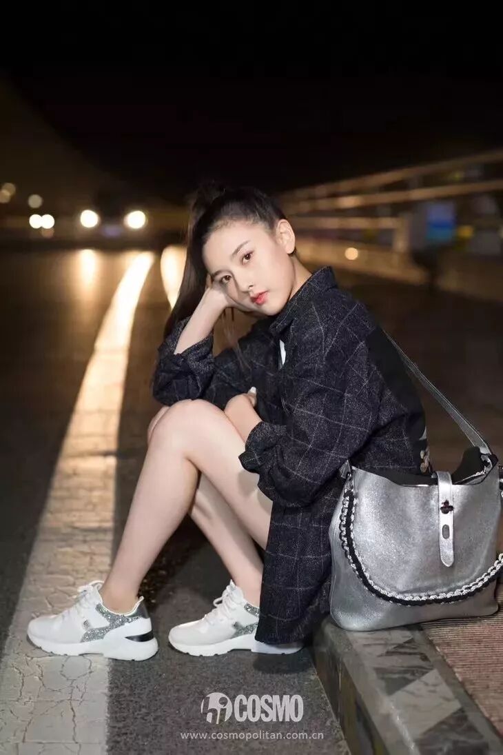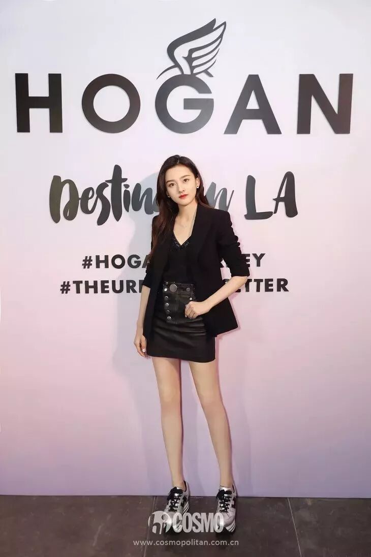 發布會現場立刻來了個超級大反差。一件西服外套搭配小皮裙,腳踩HOGAN銀色亮面運動鞋,既有著職場女性的幹練利落,又不失小女孩的靚麗時髦。