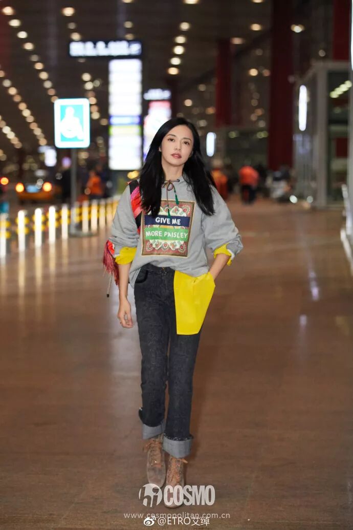 作為ETRO大中華區品牌大使,姚晨也受邀參加了本季大秀。機場出行時,她身穿ETRO 2018秋冬灰色字母衛衣搭配亮黃色絲質襯衫,輕鬆玩兒轉疊搭。肩背ETRO 50周年限定款雙肩包搭配沙色踝靴,又酷又時髦。