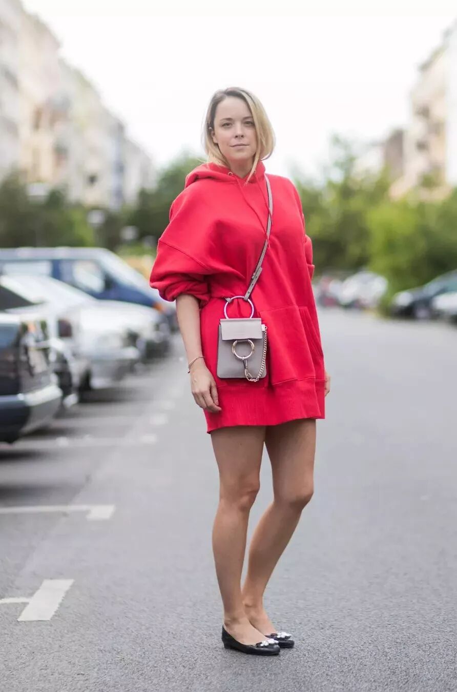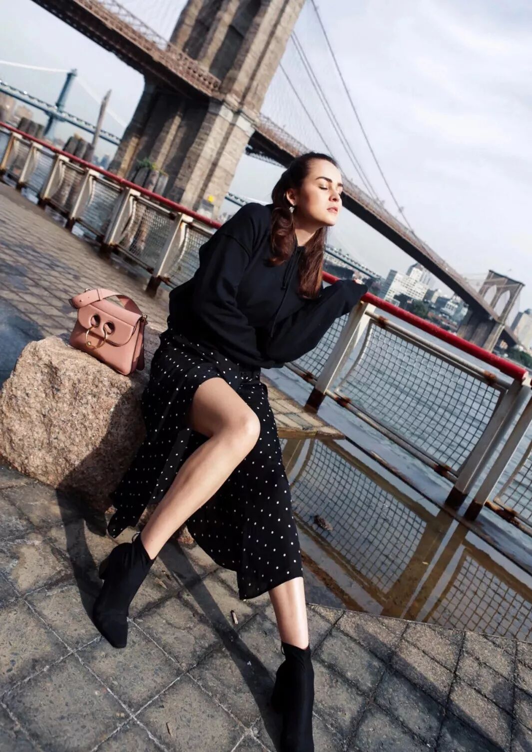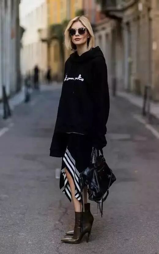 衛衣也不是和嫵媚感無緣,換上不對稱感和拼接的短裙,很基礎的衛衣也能搭出性感女人味。