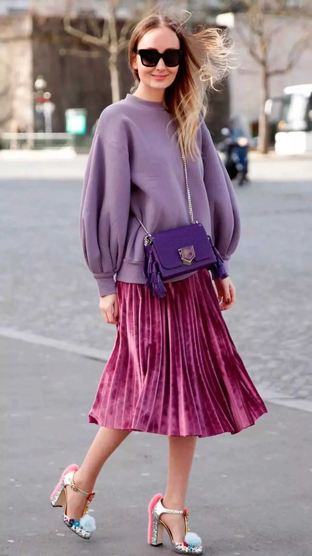 剛剛說過不適合搭配百褶短裙,但是衛衣+百褶長裙卻很推薦,優雅文靜碰上青春活力,會非常日常並適合上班族。