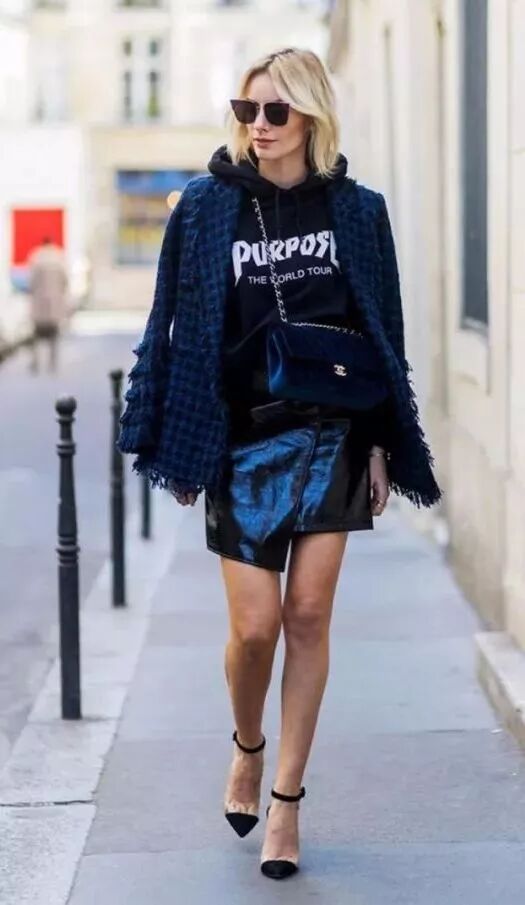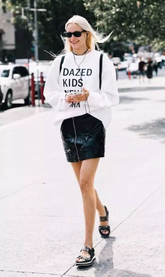 如果想當個cool女孩,可以嘗試皮短裙,尤其那些有拉鏈、不對稱設計的小皮裙,在搭配衛衣的時候,不僅帶有點睛的效果,還更顯時髦出眾哦。