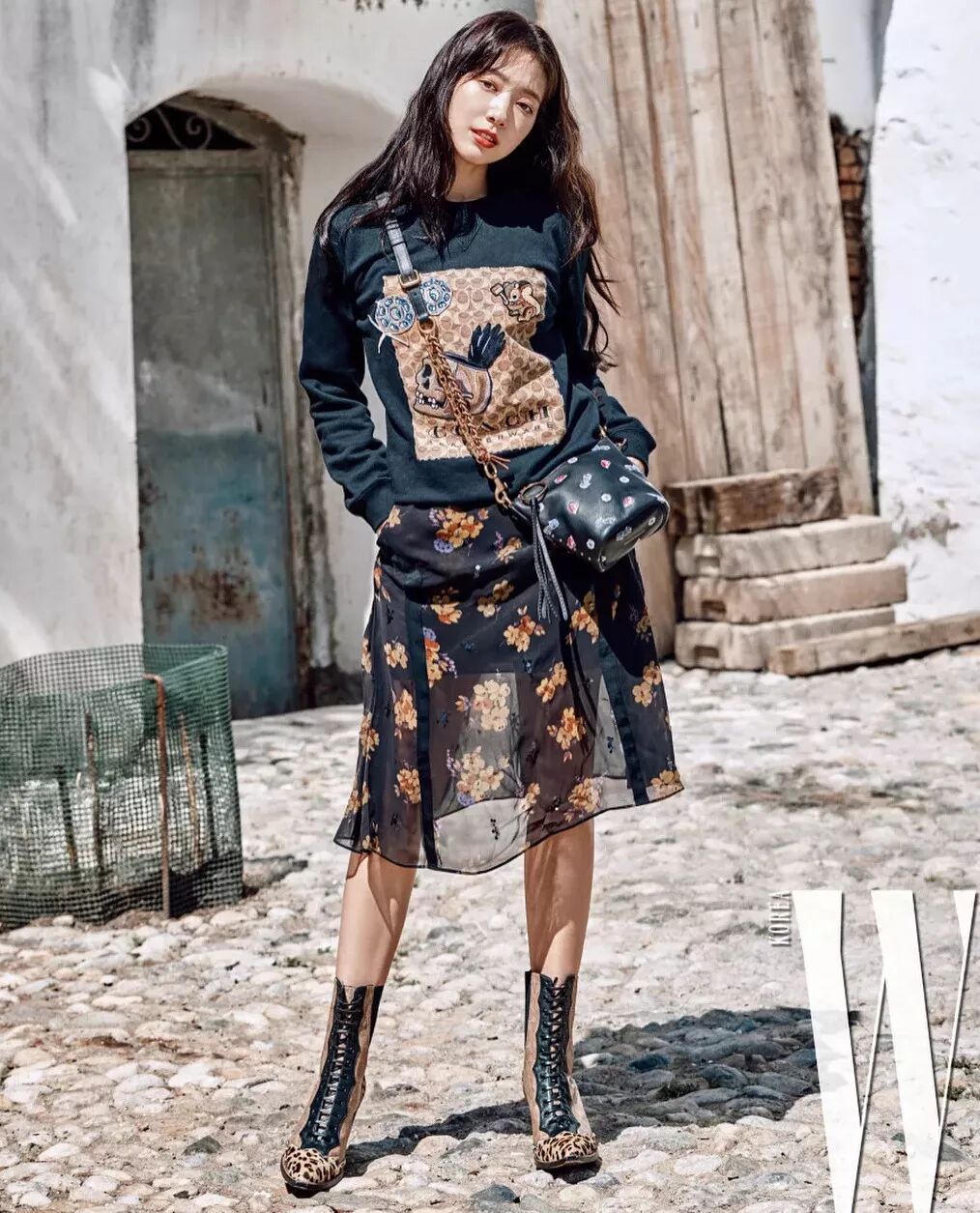 下裝的長度慢慢往長了過渡,來試試半身裙(5分裙),這種裙長非常難穿,為什麼呢?因為很容易顯出五五分身材,想穿的好看,可以學樸信惠和袁姍姍這樣選擇花裙子,通過圖案轉移注意力。
