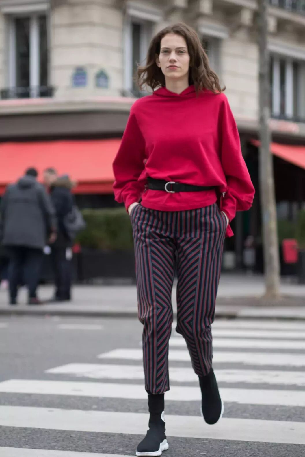 衛衣穿時髦的小tips,第一點就是注意上下廓形比例,比如一般衛衣顯寬鬆,那麼下裝廓形就要和它有對比性,比如短、窄、不規則的下裝最適合。