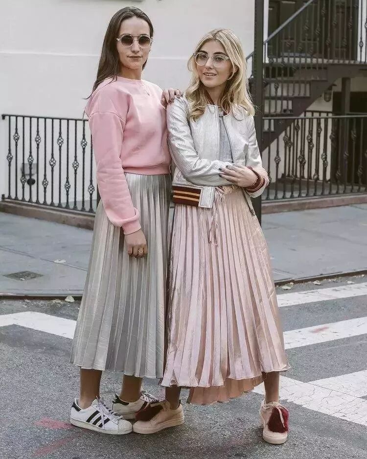 而且嘗試用材質比較薄的裙子來搭配衛衣,這種材質對比會讓人眼前一亮。