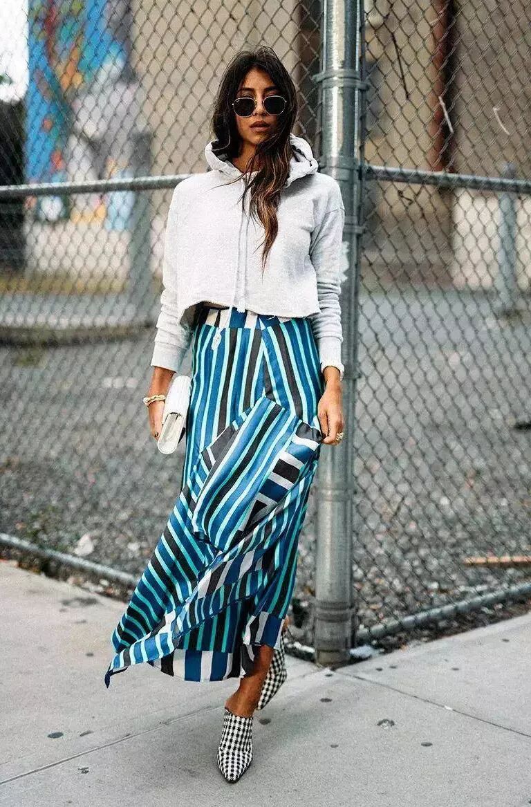 再來試試長裙,這個組合乍一聽可能會很排斥,但是今年這種穿搭卻非常流行又格外適合亞洲女孩身材,而且對衛衣長度更包容,長款短款都ok!