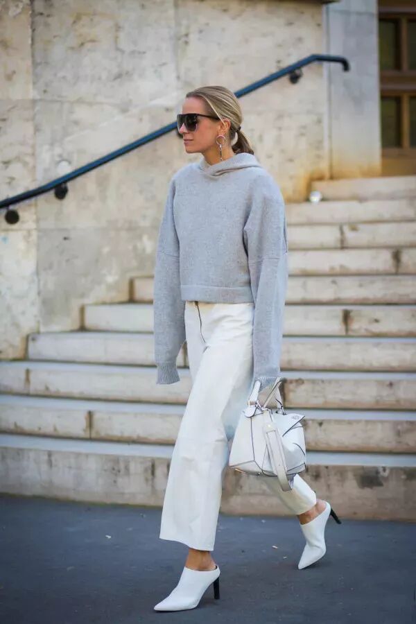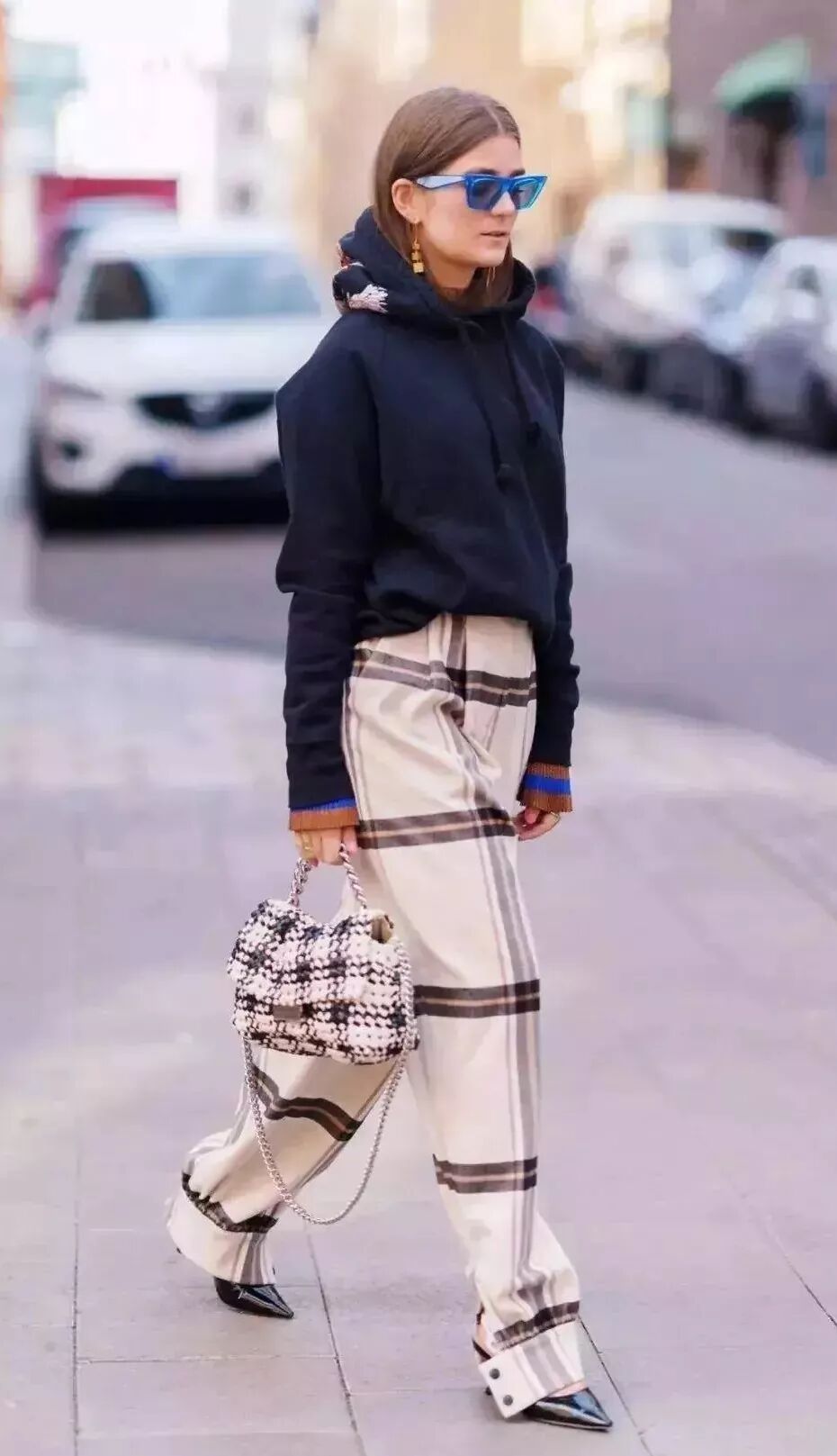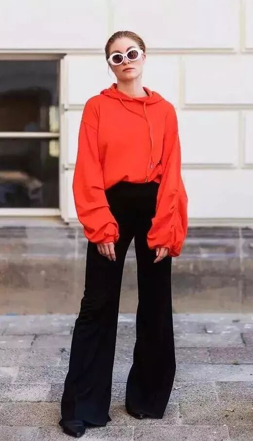 衛衣+闊腿褲這種男友力Mix的搭配,簡直不能再適合了,而且闊腿褲能很好的遮住腿粗的缺點,百搭又時髦顯瘦。但是衛衣不宜過長,否則會有邋遢感,與褲腰剛好銜接最佳,顏色也宜與衛衣有對比感。
