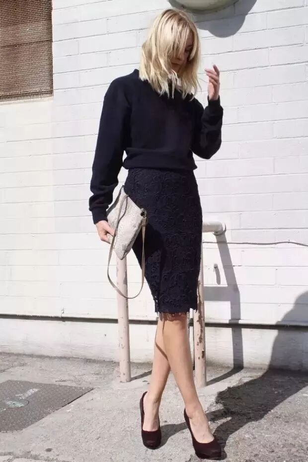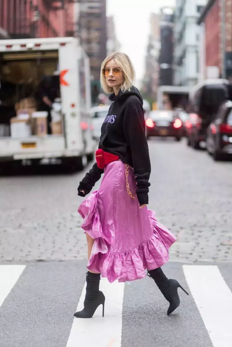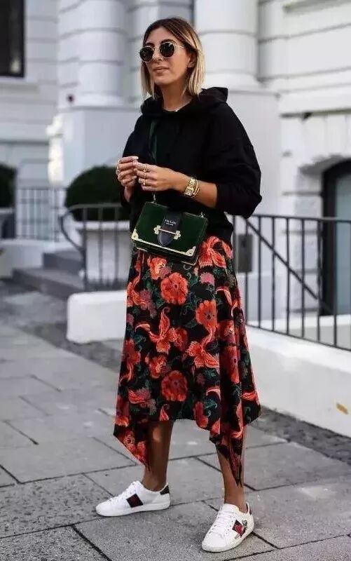這種穿法其實非常簡單,就是給休閒的衛衣加入一點正式的感覺,完全不挑裙子,不管是隆重十足的荷葉邊裙還是性感風情的蕾絲透視和高開叉裙,都很合拍。