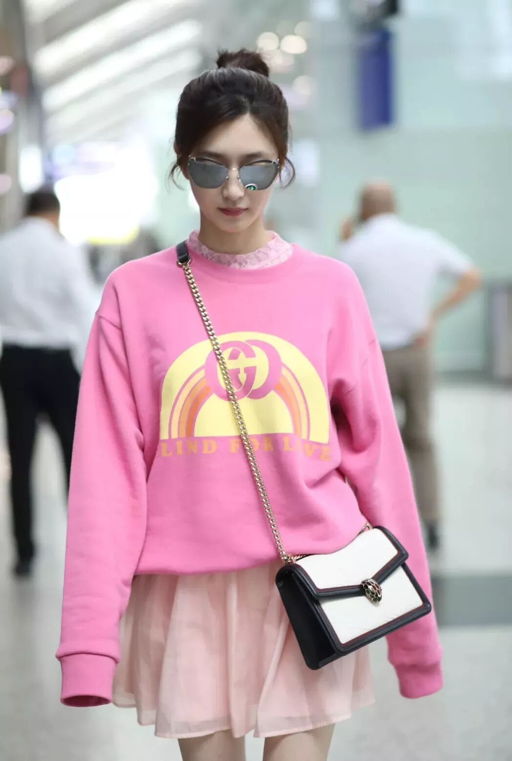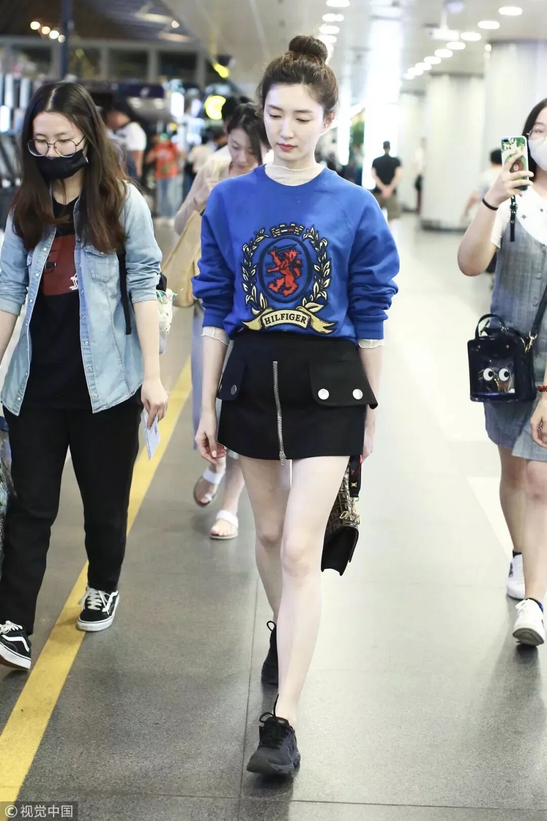 跟短褲通過上松下緊顯瘦顯高的原理很像,短裙也非常適合搭配衛衣。同樣也是女明星的大愛,比如江疏影和戚薇同時選擇寶藍衛衣+包臀黑短裙,衛衣削弱了包臀裙的成熟氣質,增添幾分隨性休閒的街頭風格,讓她們的搭配更加平易近人、適合日常。