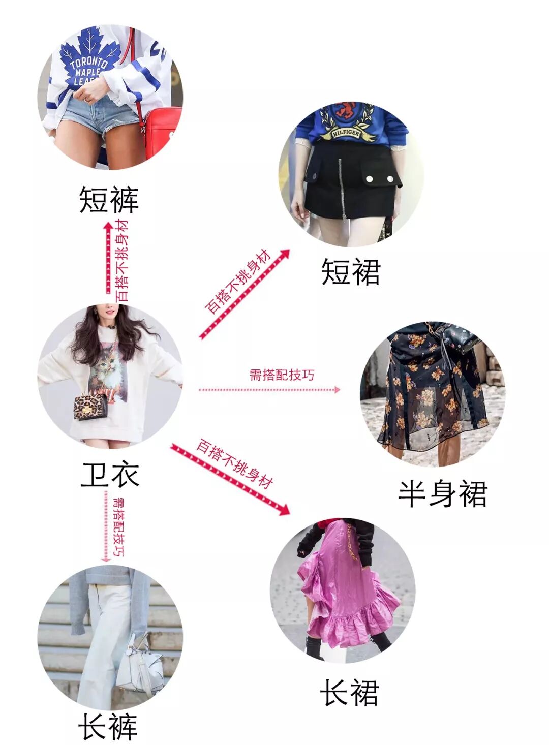 所以最後,我們回到開始的衣櫥清單,你會發現,衛衣和短褲、短裙、長裙怎麼搭都適合,半身裙需謹記搭配技巧,而長褲中,九分褲、闊腿褲不挑身材都適合,而緊身褲、牛仔褲比較挑身材,更適合下半身纖細的女生!你的衛衣CP找到了嗎!