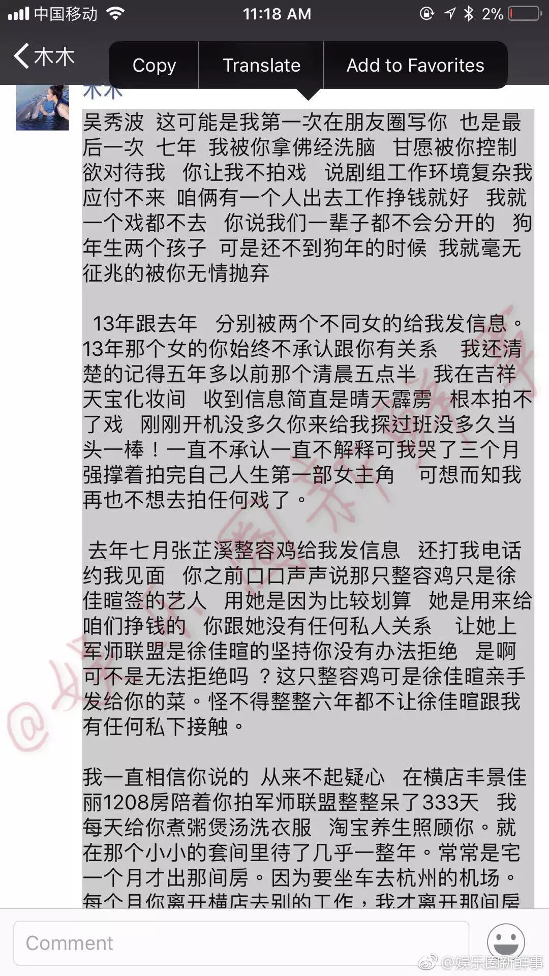 在朋友圈里,小三發了一篇長文。講述了自己在7年里的隱忍和付出,被吳秀波的控制和洗腦,還有對小四的不滿和嗤之以鼻。
