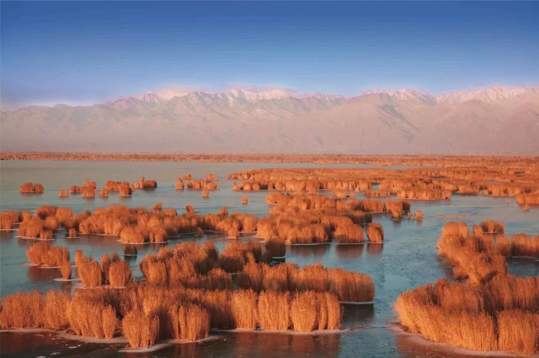 沙湖將湖水、群山、沙漠、蘆葦