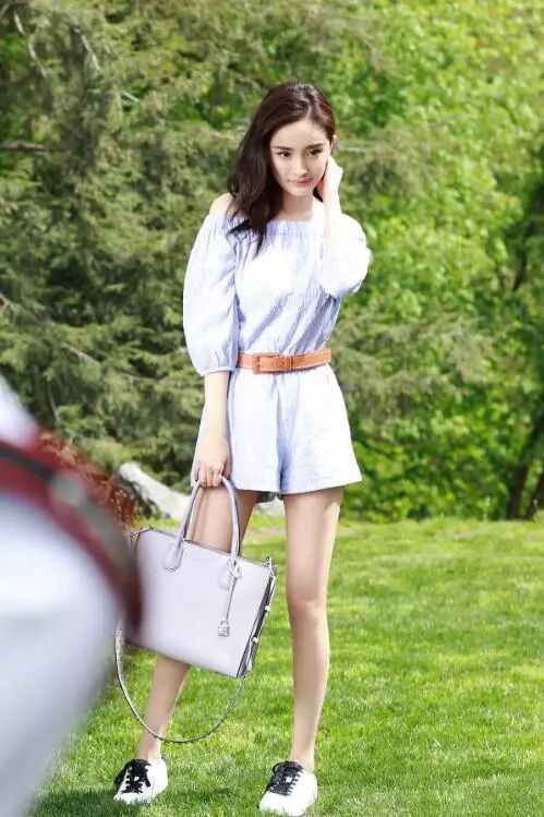 荷葉邊一字肩是今年比較百搭又流行的款式,像楊冪這樣秀出香肩和鎖骨,很性感呢!這種連體短褲搭小白鞋,很修飾腿型又很簡約時尚。