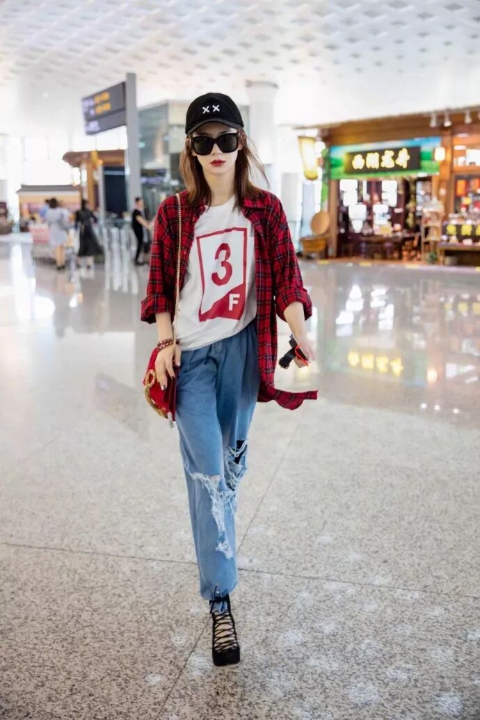 如果說馬思純格紋襯衫穿出了隨性感,那戚薇的格紋+字母T+破洞牛仔褲就更偏向潮酷街頭風了。