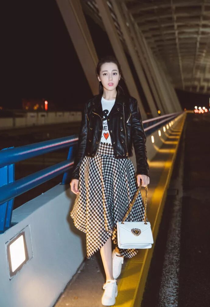 迪麗熱巴去看秀機場的皮衣+格紋裙,這樣的穿搭很適合上半身瘦的梨型身材哦。