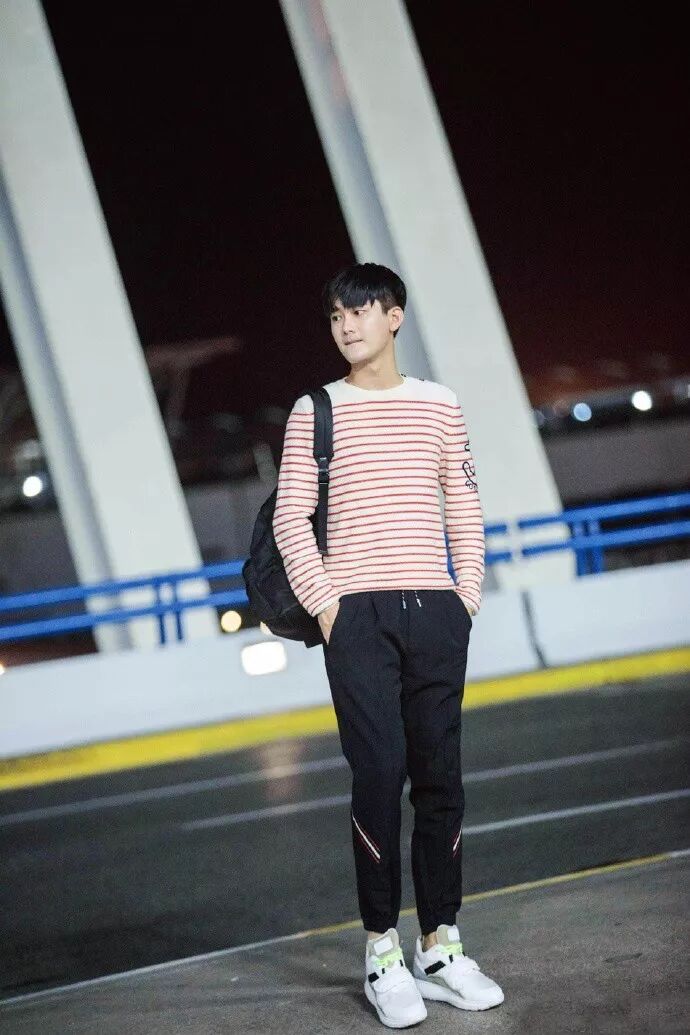 熊梓淇更偏向簡約風,條紋針織搭配運動褲和運動鞋。