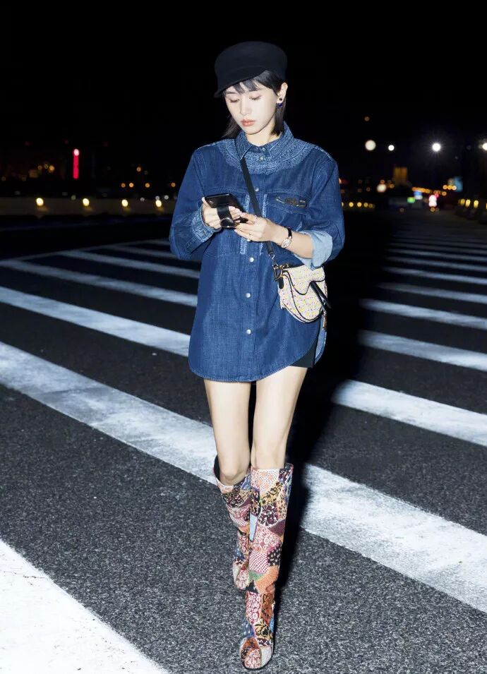 王子文的牛仔襯衫搭配高筒靴,襯衫直接當裙裝穿。