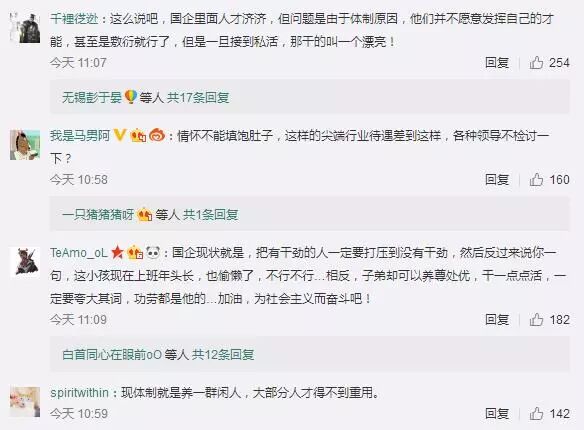 在國家層面推出了不少高層次人才培養、引進和特殊支持計劃,也啟動了對國企技術崗人才職級待遇改革的背景下,有些科研型國企顯然也該反思,「靠待遇留人、靠機制激勵人」的制度機制是否完善?尊重和優待人才,有沒有被那些僵滯的級別、編制等給架空?