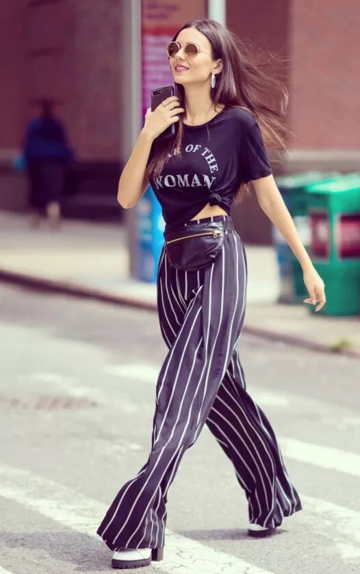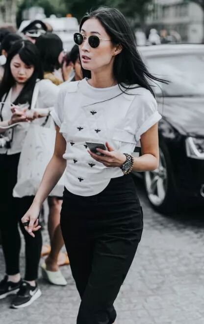 這種時髦又簡約的T恤穿搭方式也是很多明星搭配的首選,這種穿搭也可以很好的凸顯腰部曲線~
