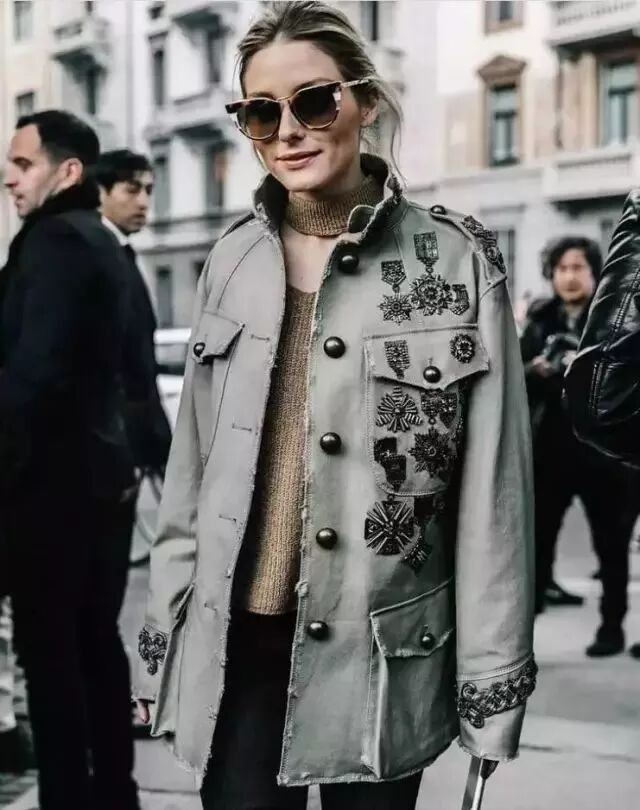 她的軍綠色外套可不下百件!最熱門的就是刺繡款和徽章款,衣服和袖子上的立體珠釘粗款中透著精致。