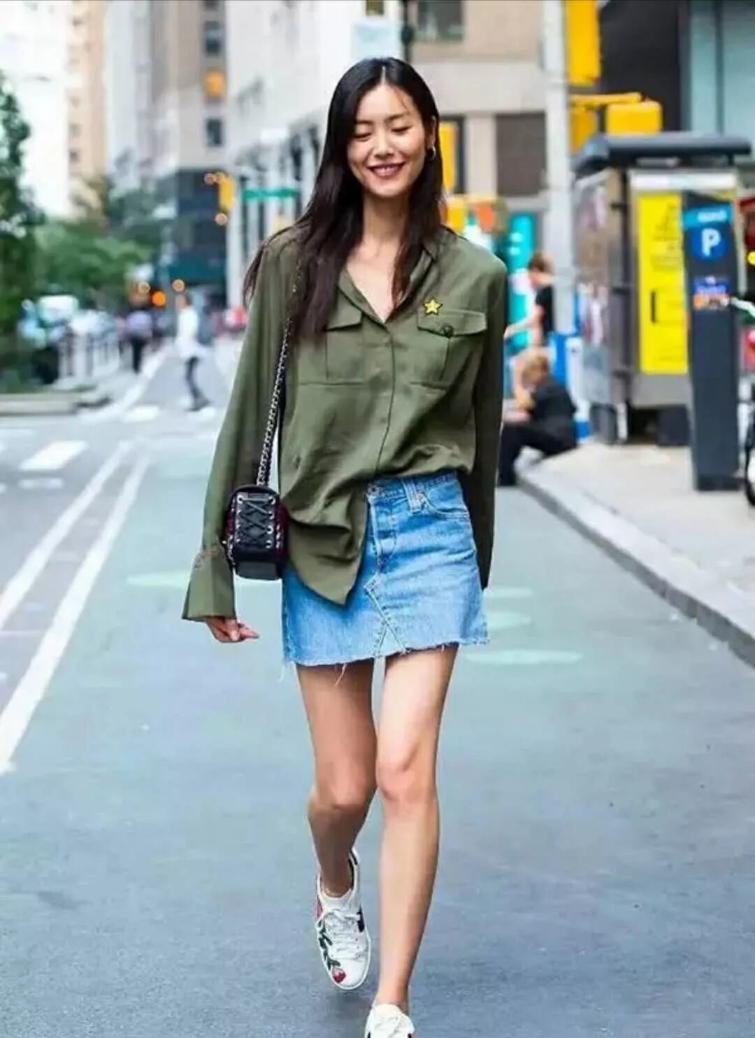 工裝外套配裙子,混搭有時候也能更出彩。2018年維密選拔表姐就是身著這套look。軍綠色工裝與牛仔裙撞色搭配的典型范例。