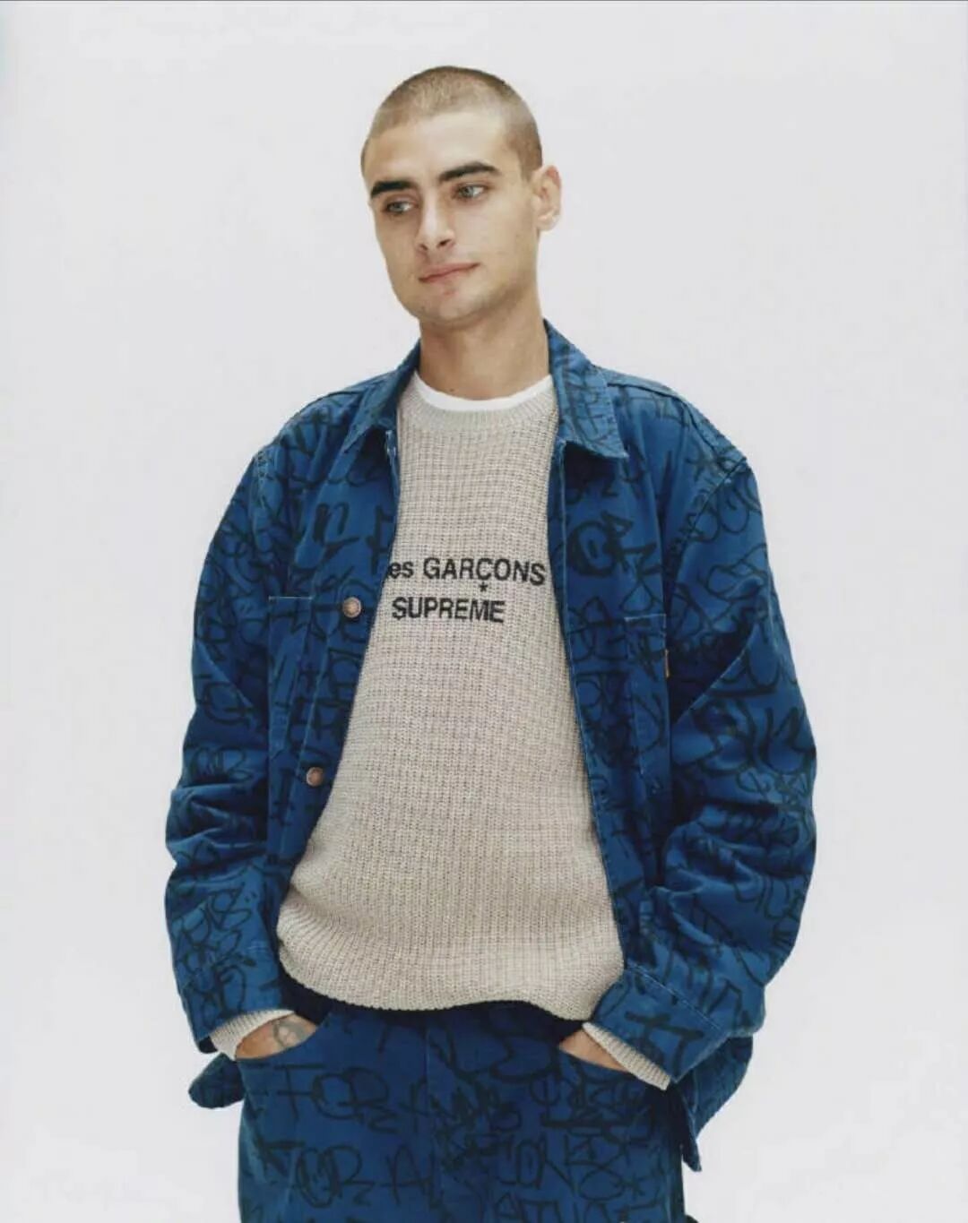 【Supreme x COMME des GARÇONS SHIRT 2018 秋季聯名系列 Lookbook】雙方今年就合作主打解構 Logo 設計和手繪塗鴉元素,帶來了紅、白、藍三色工裝外套。