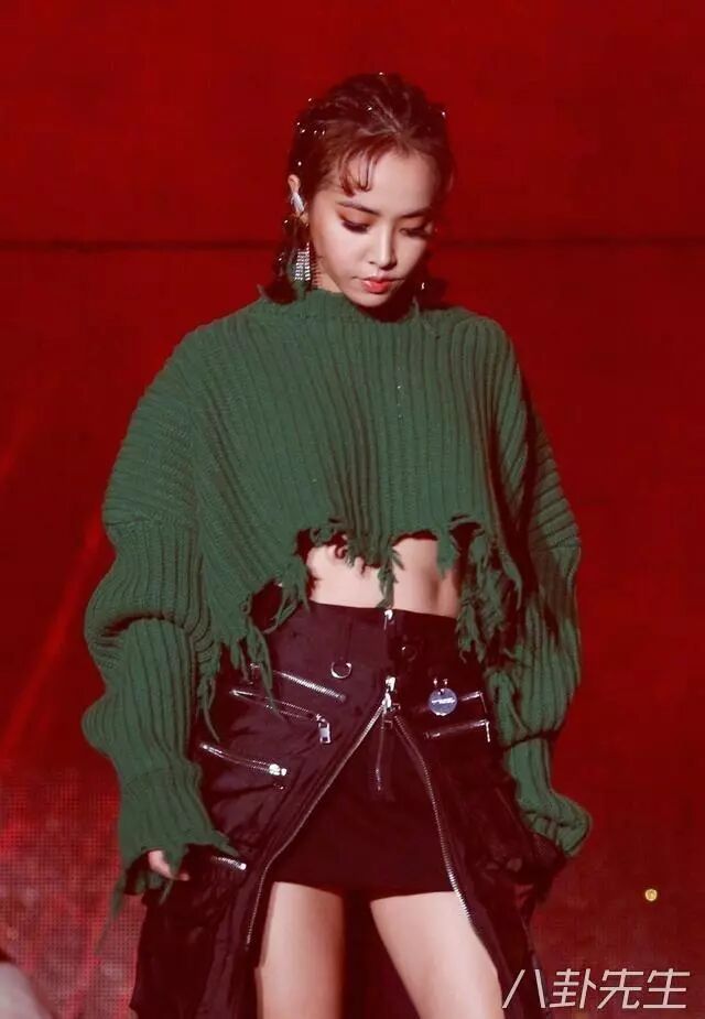 蔡依林的穿衣風格一向不按常理出牌,比如這件綠色毛衣,蔡依林並不是穿來保暖的,而是用來突出腹肌的,可以看到毛衣仿佛被故意剪爛了似的▼