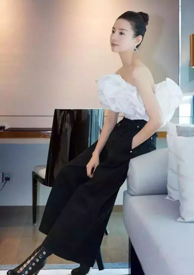 其實董潔的氣質還是好的,所以怎麼穿都是美的!白色的抹胸上衣搭配一條黑色的闊腿褲,露出香肩又很迷人,腳上一雙綁帶高跟鞋又酷帥極了。