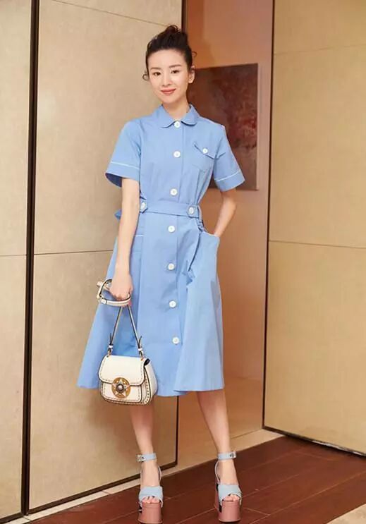 藍色主色調非常的顯膚色,又減齡,只適合董潔的氣質了,腰間寬腰帶又凸顯了小細腰,腳上一雙厚底鞋增加了高度又很休閒風。