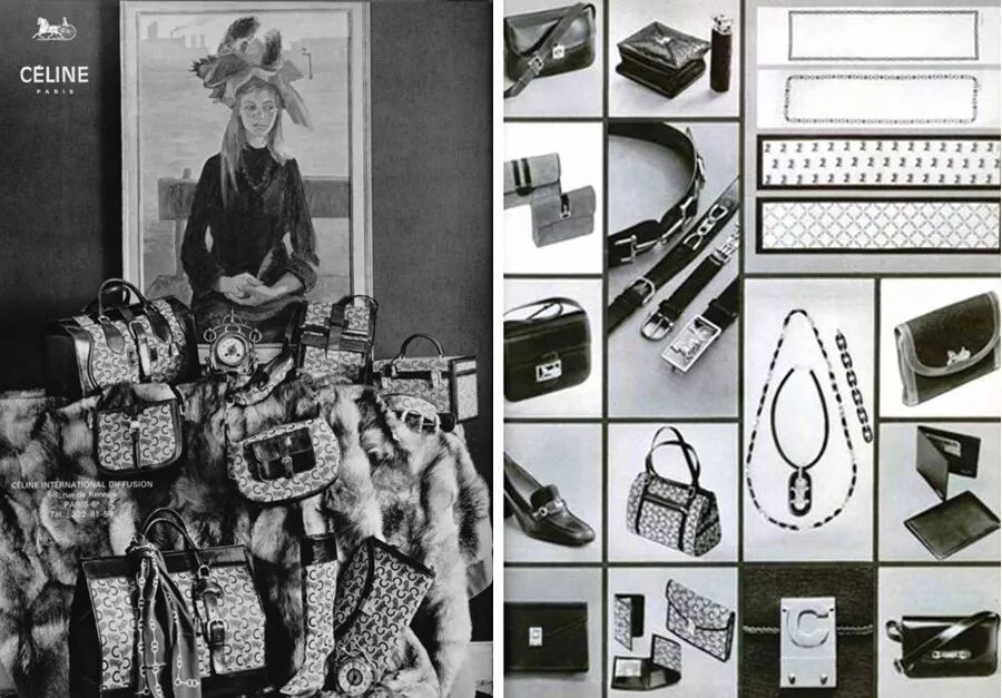 彼時的品牌LOGO「單座雙輪馬車」標誌,作為經典標識,經常出現在皮具配件上,C字包扣、C字Monogram圖案也是CELINE手袋的經典標識。