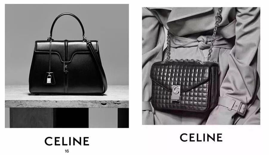 緊接著,品牌INS發布了Hedi Slimane接任CELINE後的首款手袋16(左下圖)。得名於CELINE坐落在巴黎2區薇薇安街16號的成衣工作室,這也是Hedi到任CELINE第一天就設計了的 手袋。沒過多久,又發布了第二款(右下圖),回溯品牌最初C形鎖扣和方形設計的手袋,這次竟引發了關於「新CELINE讓人窒息」的微博熱搜。