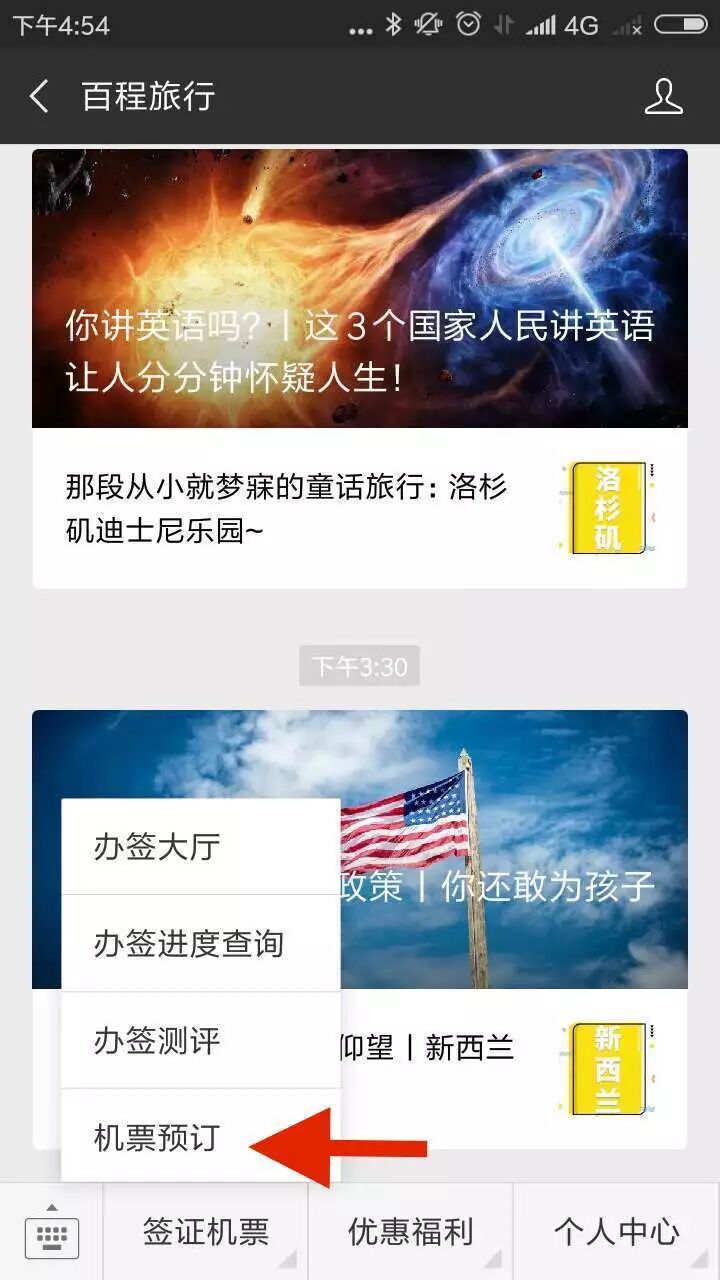 ①關注微信公眾號【百程旅行】,找到公眾號的底部菜單欄;
