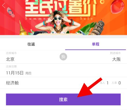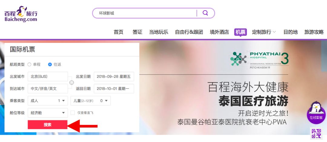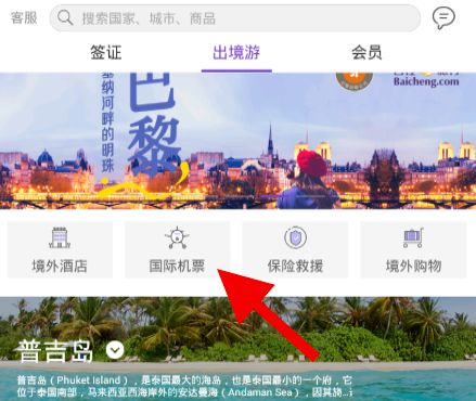 ②在出境遊頁面,點擊【國際機票】,進入機票預訂頁面;