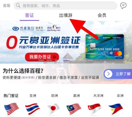 ①下載「百程旅行」APP後,打開應用,點擊【出境遊】按鈕;