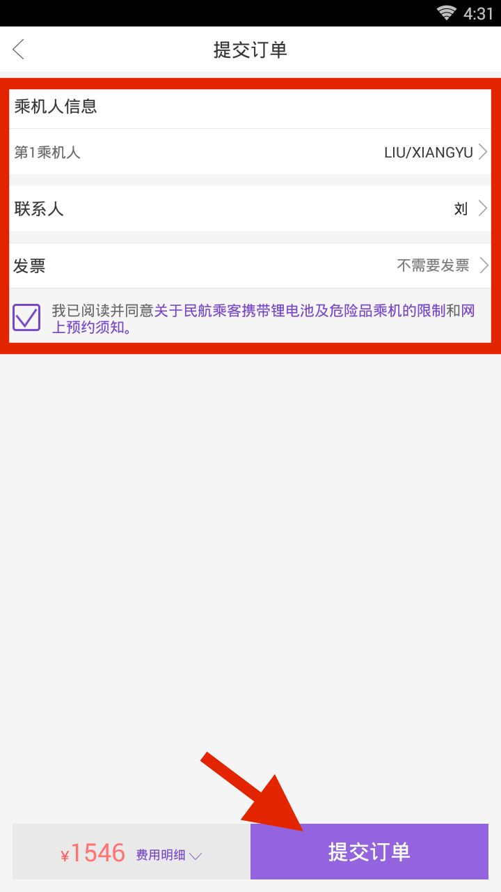 ⑤填寫好乘機人信息、聯繫人,並勾選同意相關規定,就可以成功預定了~